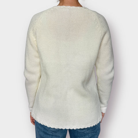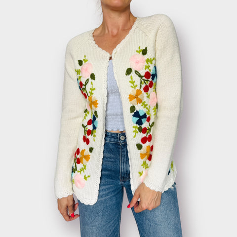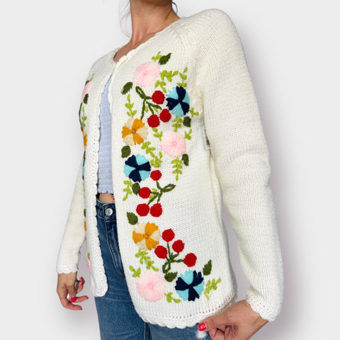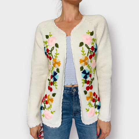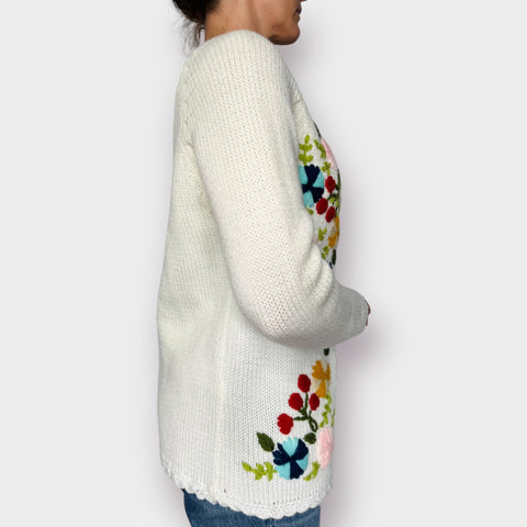 1970s cream colored sweater with colorful flowers on each side. Hook closure just at the neck of sweater--open down the front. Semi scalloped edge.